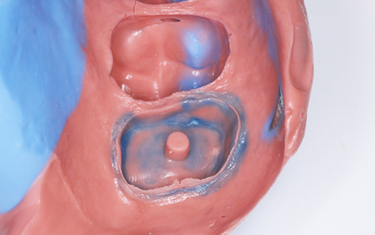 歯が割れて亀裂が歯茎の中深くまで到達している症例です。基本的には抜歯の適応ですが、強く保存を希望される場合は、技工で作製したファイバーを使用したコア(土台)を強固に接着させることで、一定期間歯を保存することができます。歯が割れた原因は強い外力のため、金属を使用せず、ファイバーを選択します。